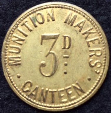 An anonymously issued 3d brass canteen token issued for use by workers employed in a British munitions factory canteen during the Great War of 1914-18.