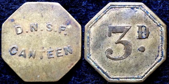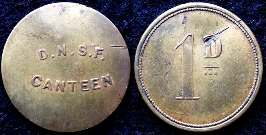 Obverse: Raised legend in two arced lines in centre of field reads D.N.S.F. / CANTEEN
