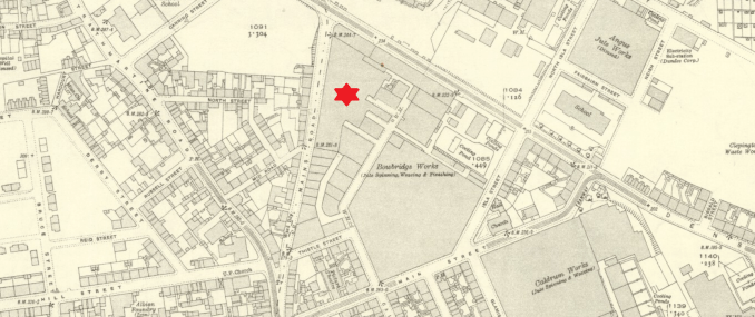 The Bow Bridge Works, Dundee. Located between the V-shaped junctions of Mains Road (left) and Main Street (right) – Approximate Buildings Occupied by the Dundee N.S.F. are outlined in green. Image taken in 1927