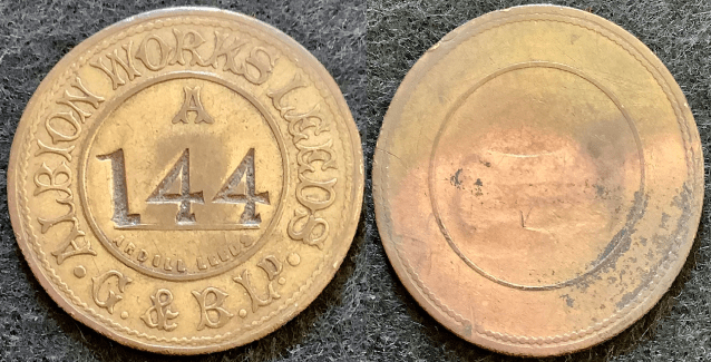 Obverse: Raised die stamped legend around outer upper edge reads . ALBION WORKS LEEDS . and in lower part G. & B. LD. all within a beaded outer and inner raised circular borders. In upper field the letter A below which is the incuse stamped identification number 144 above a raised line. Below the maker’s signature ARDILL LEEDS in small lettering.