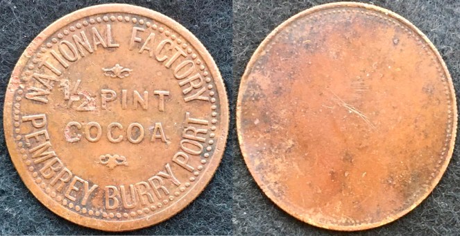 - The reference to “National Factory” in this token’s legend likely indicates that it was issued for use in the canteen of N.F.F. No.1 as opposed to H.M.E.P. – Pembrey.