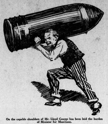 A contemporary newspaper cartoon showing Lloyd George burdening the responsibility of providing munitions for the war effort
