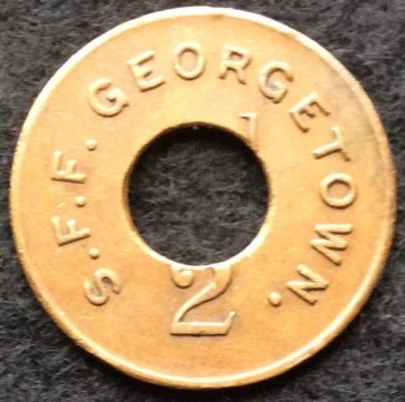 Obverse: Raised legend around outer raised border reads S.F.F. GEORGETOWN. Within centre field the denomination ½d
