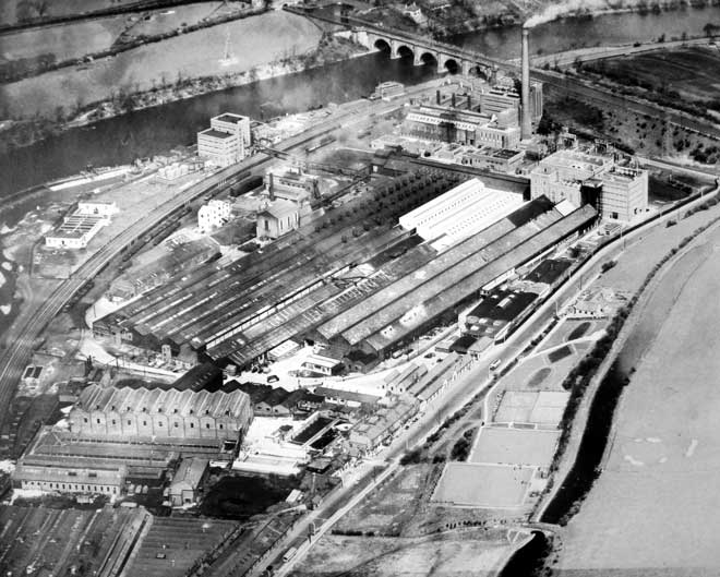 Aerial view of the Lansil works (the former site of the N.P.F. – Lancaster) showing Lancaster Power Station at the top of the picture, and Caton Road Wagon Works at the bottom left. c.1950s (© Images are copyright, Trustees of the King’s Own Royal Regiment Museum)
