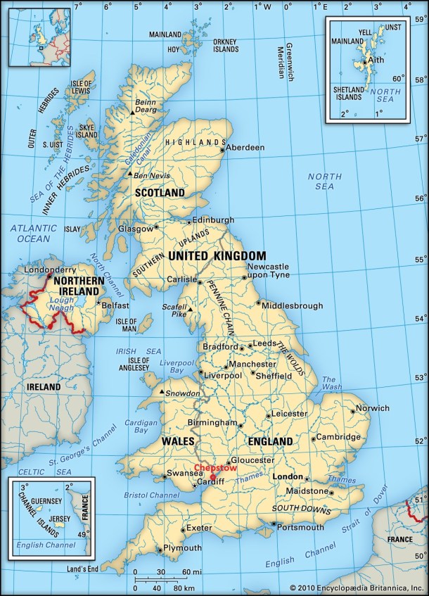 Chepstow, Monmouthshire – On west bank of the River Wye as it discharges into the Bristol Channel.
