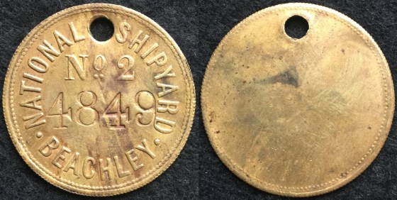 Obverse: Raised legend around upper edge within raised and beaded borders reads .NATIONAL SHIPYARD. and below No.2 plus around bottom, BEACHLEY . Stamped identification number 4849 in centre field.
