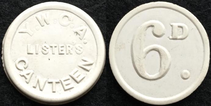 Obverse: Raised legend around upper edge reads Y.W.C.A. and around bottom edge CANTEEN all within an outer raised edge border. In the centre field, the legend LISTER’S.