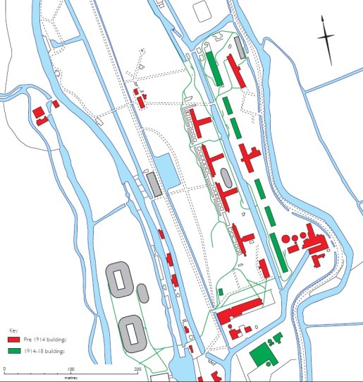 A plan of the R.G.P.F at Waltham Abbey – Buildings in red are pre-1914 while those in green date to the expansion of the site during the Great War (1914-1918).