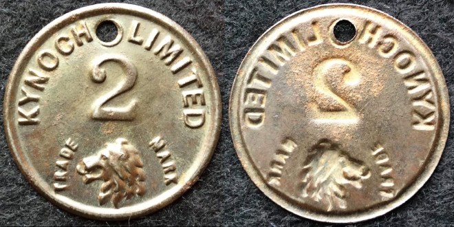 Obverse: Legend around upper half reads KYNOCH LIMITED with a large raised number 2 in the centre field below which is a lion’s head facing left with the words TRADE and MARK either side of it.