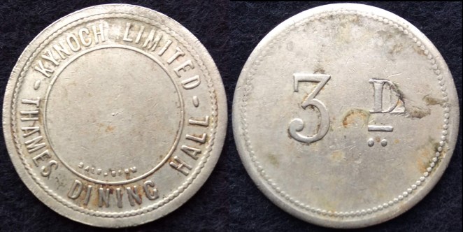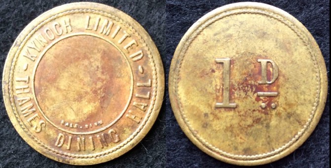 Obverse: Raised legend around outer edge and within an outer beaded border and inner circle reads – KYNOCK LIMITED – THAMES DINING HALL . In small raised letters around bottom of inner circle is the maker’s signature SALE . BIRM