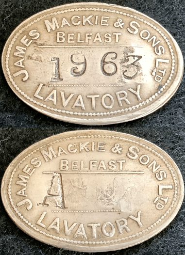 The obverse and reverse of a Lavatory Token used at James Mackie & Sons Ltd. of Belfast