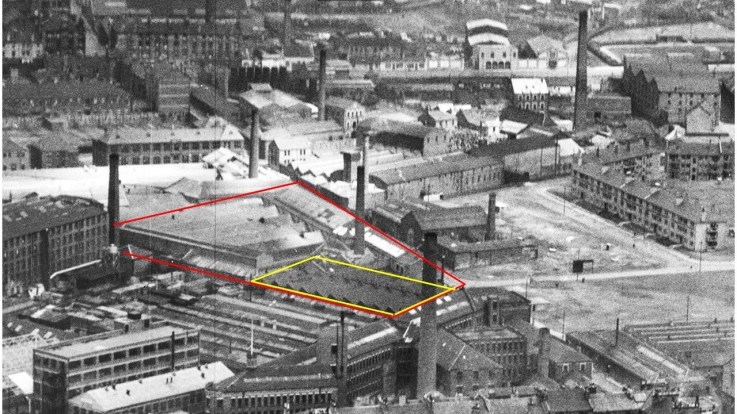An aerial photograph of Grant’s Mill taken in June 1948. The full extent of the mill site is outlined in red with what is believed to be the buildings occupied by the Mile End N.P.F. can be seen in the southern corner of the site outlined in yellow.