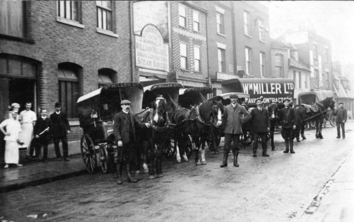 A view of William Miller Limited’s Steam Baker and delivery fleet in Kent Street, Portsea (c.1910s). The sign above his premises proudly advertises the fact that the company were ” Contractors to the Admiralty” .