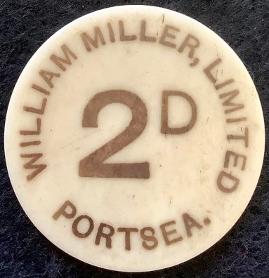 Obverse: Legend around upper edge in black lettering reads WILLIAM MILLER , LIMITED and around lower edge PORTSEA . with denomination value of 2 D in centre field.