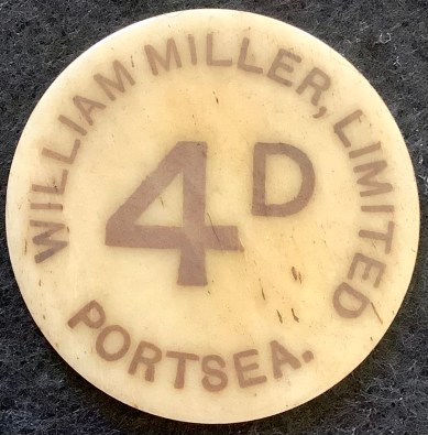 Obverse: Legend around upper edge in black lettering reads WILLIAM MILLER , LIMITED and around lower edge PORTSEA . with denomination value of 4D in centre field.