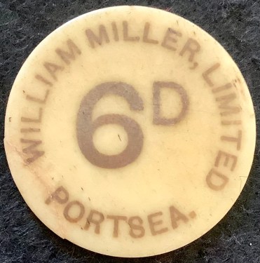 Obverse: Legend around upper edge in black lettering reads WILLIAM MILLER , LIMITED and around lower edge PORTSEA . with denomination value of 6D in centre field.